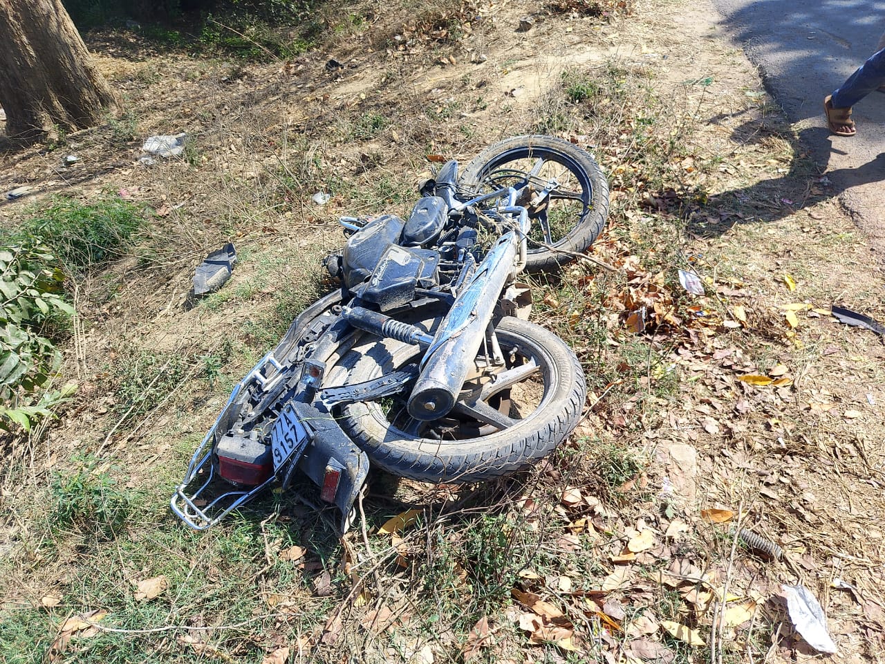 लोडर का पिछला टायर फटने से सड़क किनारे खड़ी बाइक को टक्कर मार दी लोडर जाकर खनदक मे जा गिरा